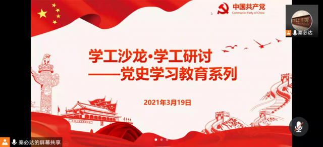 3月19日下午,太阳成集团tyc9728学工办积极响应习近平总书记党史学习教育的全面动员,举行了第23期学工沙龙研讨。学院团委书记秦必达主讲,学院党委副书记赵异肖、学工办主任宗剑、以及全体学生兼职辅导员线上参与了学习。
