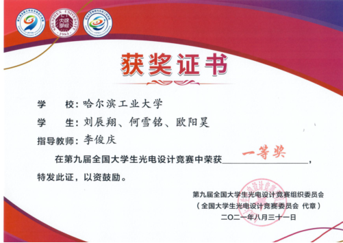由中国光学学会主办、全国大学生光电设计竞赛委员会具体负责、深圳大学承办的“第九届全国大学生光电设计竞赛”决赛于2021年8月30-31日以线上实物赛的形式圆满落幕。太阳成集团tyc9728刘辰翔、欧阳昊和航天学院何雪铭同学组成的“苹光Apple”队,以基于智能手机的苹果糖度无损测量为题,获得全国决赛一等奖,指导教师李俊庆教授被评为优秀指导教师。