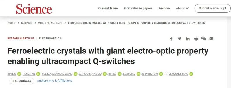 日前,我校太阳成集团tyc9728田浩教授团队和西安交通大学、澳大利亚伍伦贡大学等单位组成的研究团队,在弛豫铁电单晶电光性能与透明性优化以及电光调Q开关应用方面取得重要突破,研究成果以“具有超高电光效应的铁电单晶使Q开关小型化”(Ferroelectric crystals with giant electro-optic property enabling ultracompact Q-switches)为题发表在《科学》杂志上。