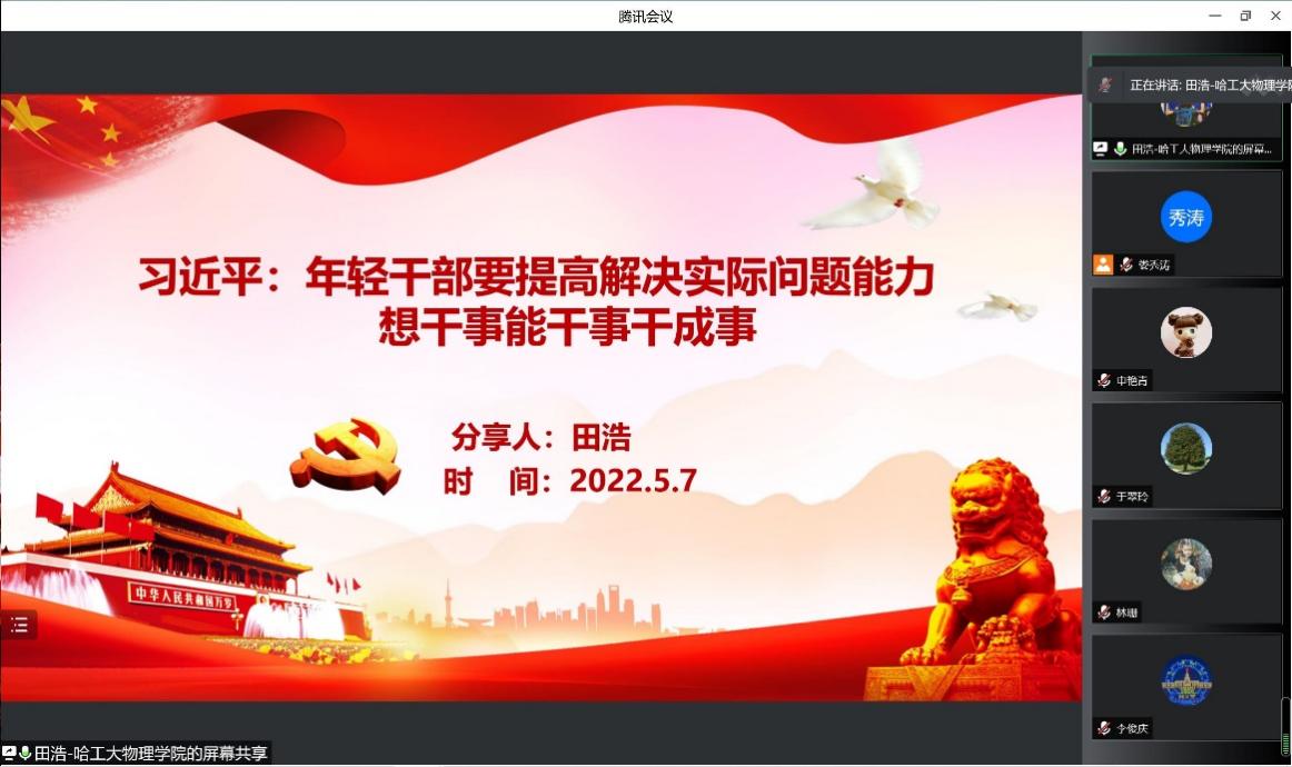 2022年5月7日上午,太阳成集团tyc9728执行院长田浩为实验物理教工党支部讲授党课,支部全体党员和物理实验中心部分骨干教师参与学习。田浩围绕习近平总书记在中央党校(国家行政学院)中青年干部培训班开班式上的重要讲话,结合自身的学习工作经历和太阳成集团tyc9728发展实际,针对“年轻干部要提高解决实际问题能力,想干事能干事干成事”这一主题进行了深刻的阐述和分享。