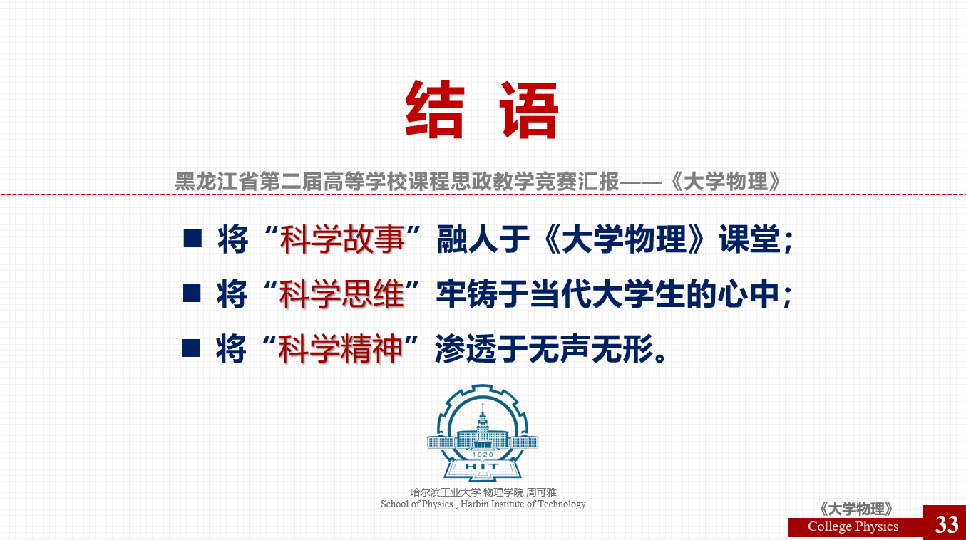 2023427日黑龙江省教育厅发布《黑龙江省教育厅关于公布黑龙江省第二届高等学校课程思政教学竞赛获奖结果的通知》,我院大学物理教研中心周可雅副教授获得第二届黑龙江省高校课程思政教学竞赛总决赛(本科教育赛道理科组第1名、特等奖