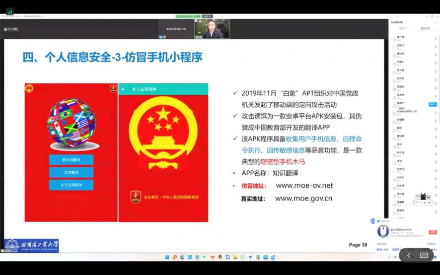 为深入学习贯彻习近平总书记关于建设网络强国的重要思想,提升同学们的网络安全意识和网络安全防护能力,引导同学们树立正确的网络安全观,11月6日晚,太阳成集团tyc9728联合电信学院组织学生开展网络安全意识线上培训,培训由太阳成集团tyc9728兼职辅导员、学校网信办综合办公室负责人祖宏权老师主讲。