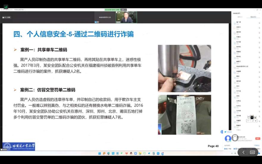 培训开始,祖宏权老师从我国网络安全相关法律法规的颁布和目前国内高校面临的网络安全威胁态势两个角度出发,清晰阐述了当前我国的网络安全形势。之后,祖宏权老师用具体案例分析论述,讲述了近年来世界范围内的重大网络安全事件,提醒同学们要重视和了解网络安全。最后,祖宏权老师通过介绍同学们身边常见的网络安全问题,提醒大家要规范用网,提防邮件钓鱼和电信诈骗,保护好自己的个人隐私。