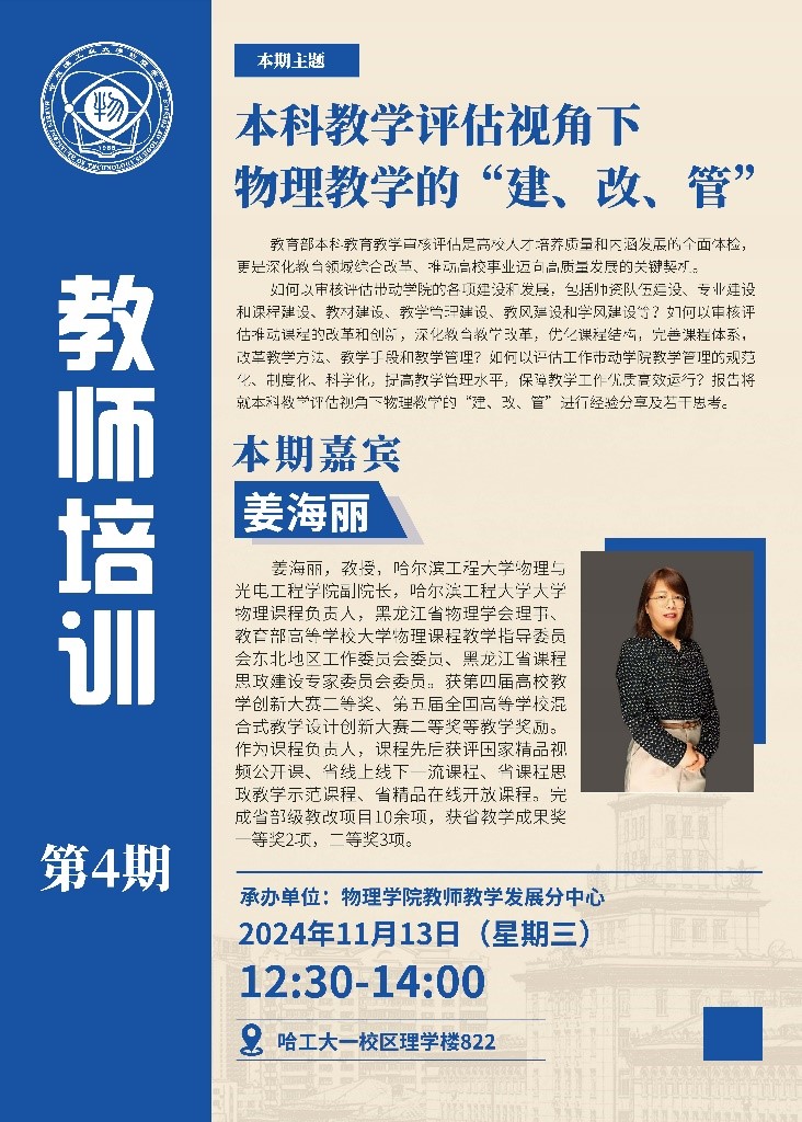 太阳成集团tyc9728教师发展分中心于202411131230在理学楼822举办了教师培训讲座。本次讲座由周可雅教授主持,特邀哈尔滨工程大学姜海丽教授,做了题名为“本科教学评估视角下物理教学的“建、改、管””的报告。