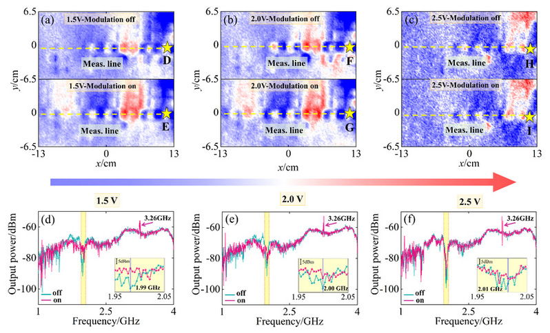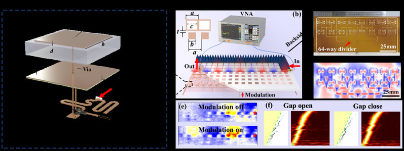 针对这一技术难题,团队首次在实验上精准操控时间调制下二维超表面界面表面波传输及其色散关系中带隙闭合现象,通过理论建模、电磁场仿真以及实验测量相结合的方式,创新性地提出利用超表面结构模拟时空光子晶体中表面波传输的方法。该研究设计了加载变容二极管的时空超表面结构,通过改变外加直流偏置电压以及时间调制参数,可以实现表面波的本征频率偏移,调控超表面阻抗,从而使表面波色散关系中混合带隙发生闭合,导致了界面上表面波的传输跳变。团队提出的时空超表面带隙闭合机制,为超快开关设计和短脉冲发生等应用提供了实验平台。
